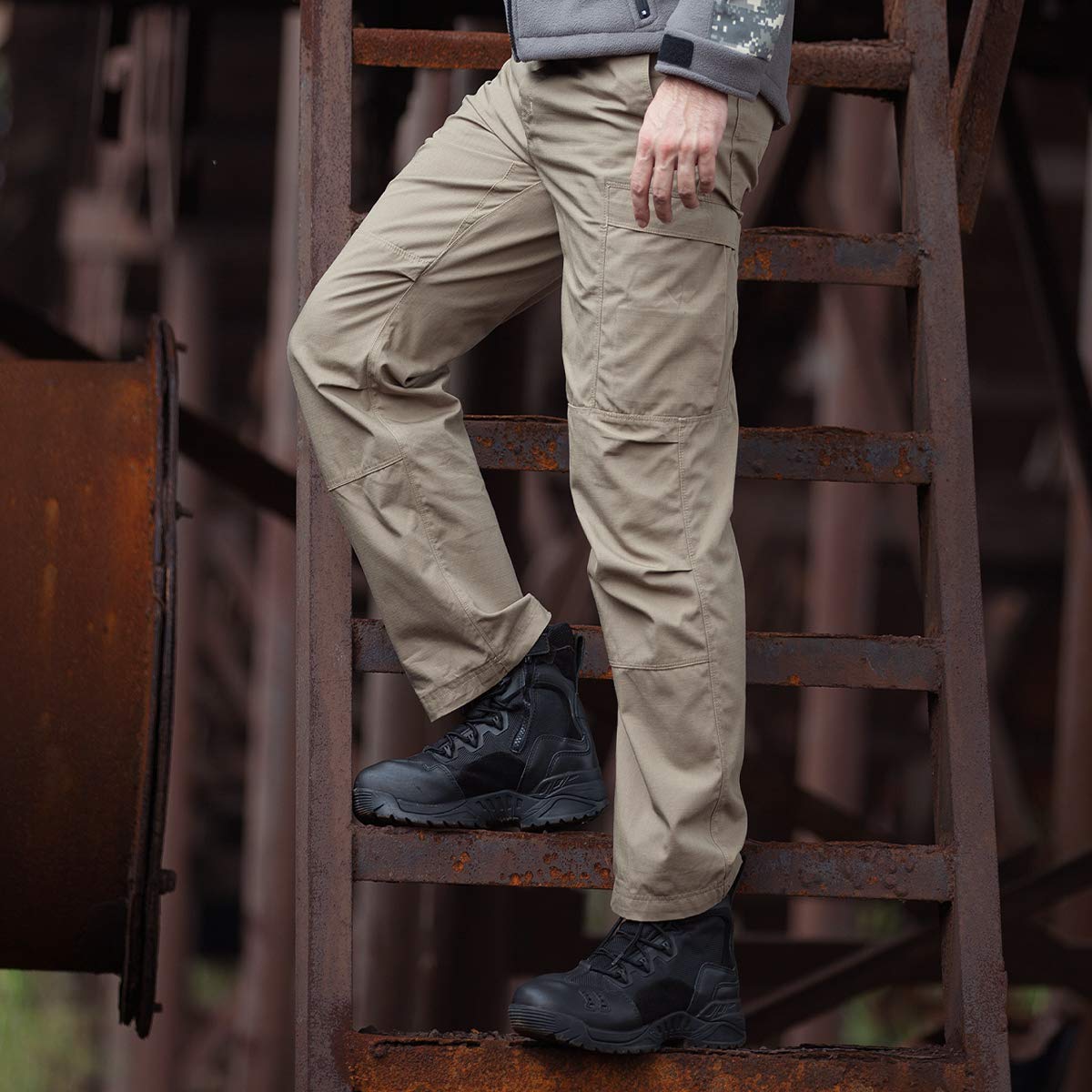 Practical Features A YKK zipper with a button-fly closure provides reliable security and avoids discomfort. Belt loops accommodate tactical belts for added stability, while a D-ring offers a convenient spot to attach keys or small tools.